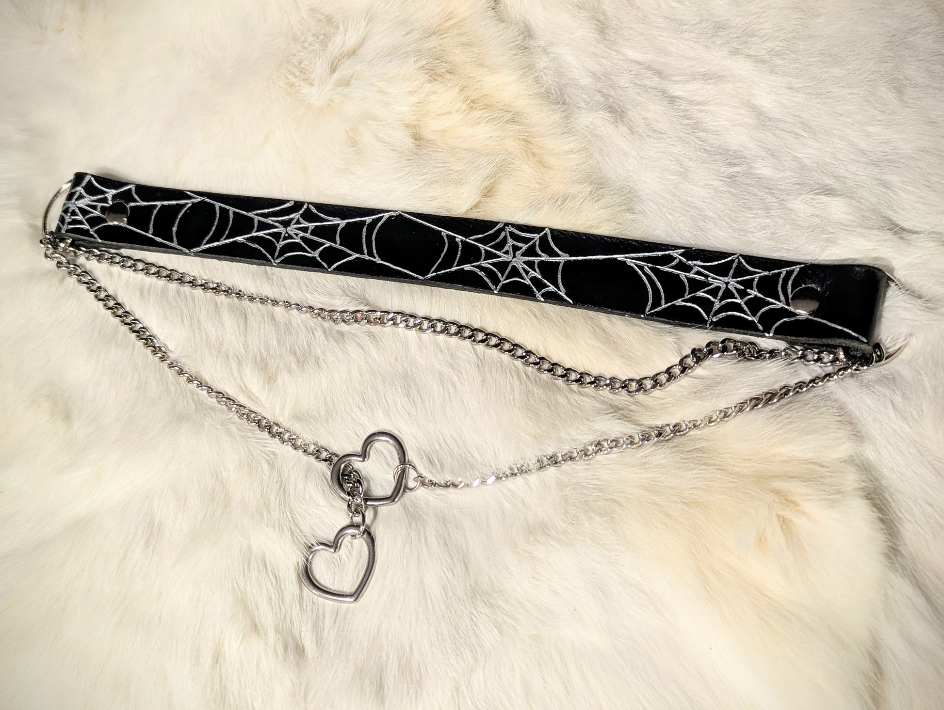 Black leather martingale leash collar with hand tooled and painted spiderweb pattern